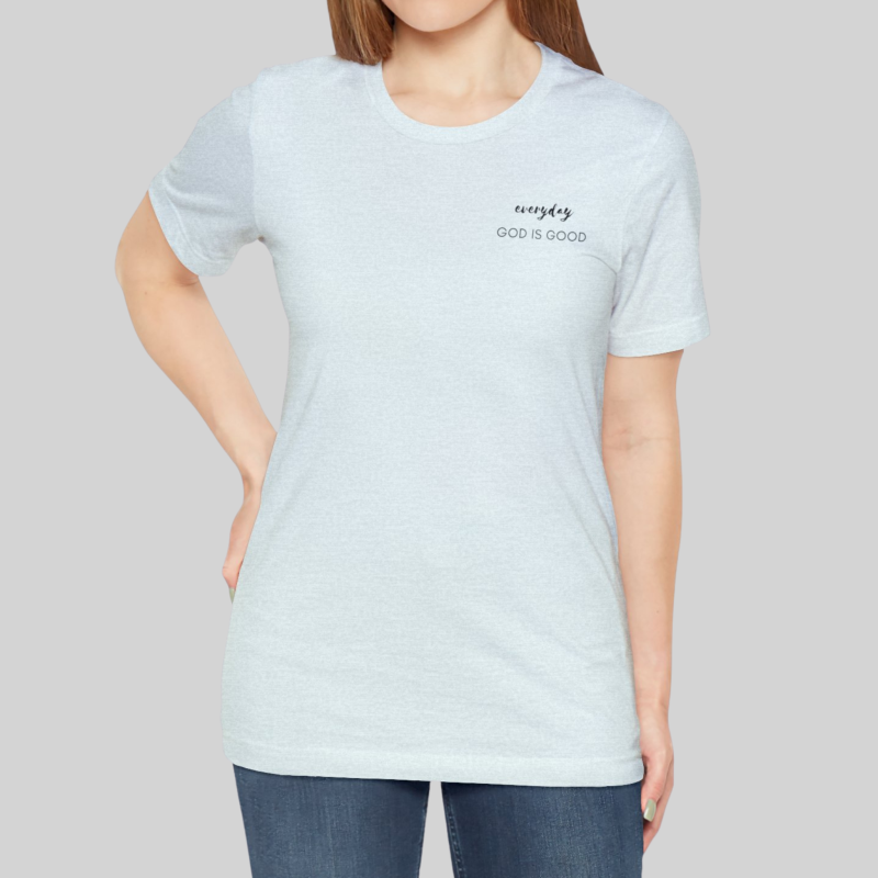 Elevate your casual style with purpose and grace in our “Everyday God Is Good” Women’s Casual Cotton Tee. Crafted for comfort and adorned with a beautiful Christian design, this tee seamlessly blends faith and fashion. Experience the joy of everyday comfort with our tee, made from a soft and breathable fabric that gently caresses your skin. The carefully chosen message on the tee serves as a reminder of the goodness of God in our everyday lives.
