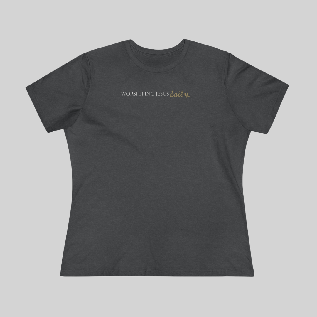 Our “Worshiping Jesus Daily” cotton women’s tee serves as a reminder of the importance of daily communion with Christ. This simple phrase embodies the essence of a life lived in constant connection with our Savior. Crafted from soft and breathable cotton, this tee offers all-day comfort that is perfect for everyday wear. The fabric is gentle on the skin, ensuring a cozy feel whether you’re at home, running errands, or attending church services. The tee is designed with a classic fit that is flattering for all body types, providing a comfortable and relaxed silhouette.